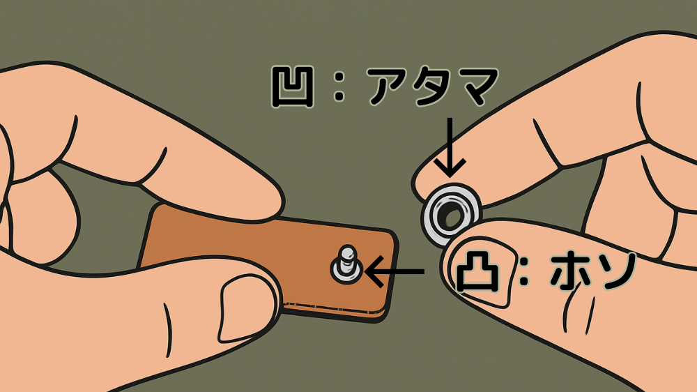 - 裏側から**カシメの頭(メス側)**をしっかりとはめ込む