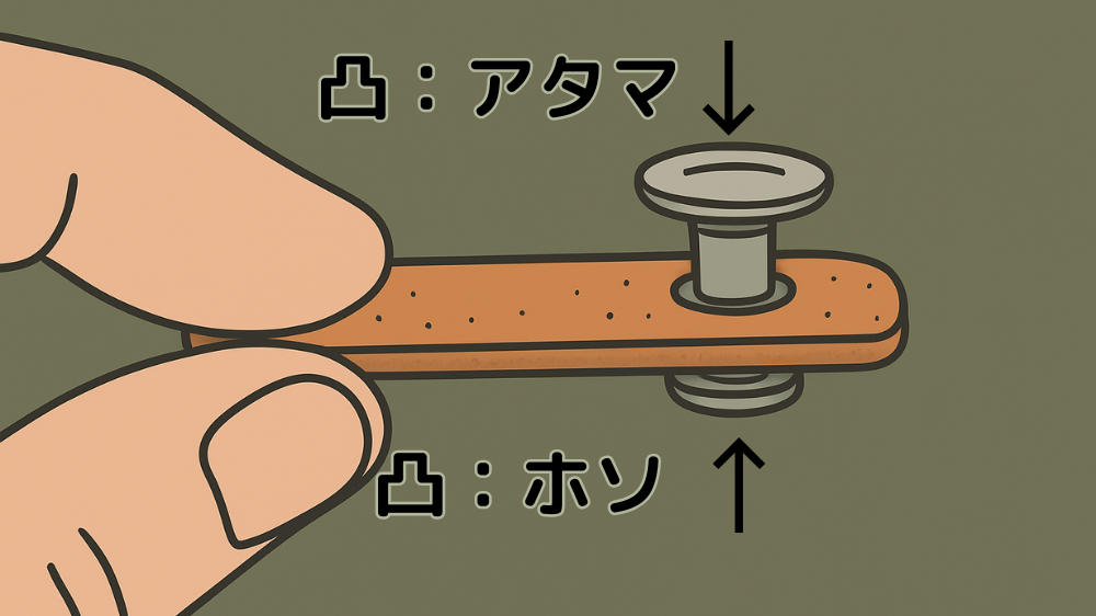 - 革の**表側からカシメの足(オス側)**を差し込む
