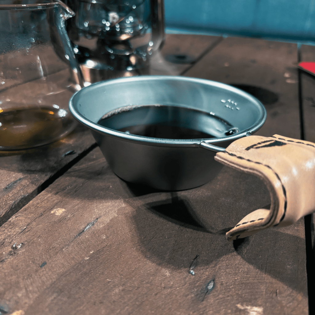 金属と火の道具で構成されがちなキャンプのコーヒーシーン。そこに一点、レザーアイテムが加わるだけで、空間全体が引き締まり、ギアとしての存在感が一段と際立つ。