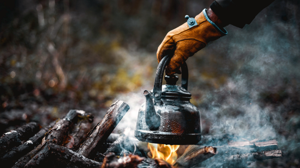黒いポットには焚き火の煤が少しずつ染み込んで、唯一無二の風合いを醸す。
