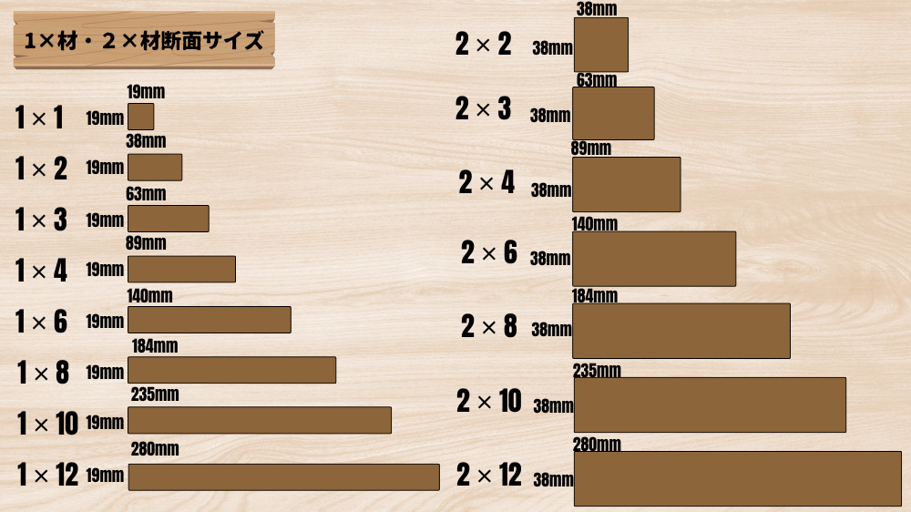 ポイント: 厚みは「ワンバイ材(1×材)=19mm」「ツーバイ材(2×材)=38mm」と覚えておけば、設計図が書きやすくなります。