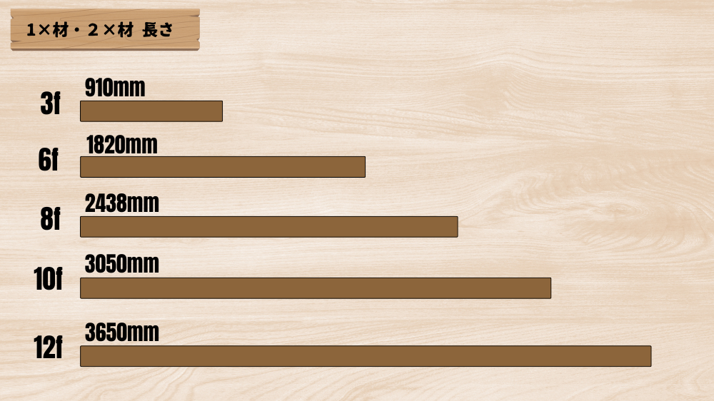 ワンバイ材・ツーバイ材は長さの規格も統一されていて、単位はf(フィート)であらわされます。1f(1フィート)は、約30.48㎝でワンバイ材・ツーバイ材の規格は基本的に 3f・6f・8f・10f・12f があミリ(㎜) 単位に換算すると下の画像のようになります。