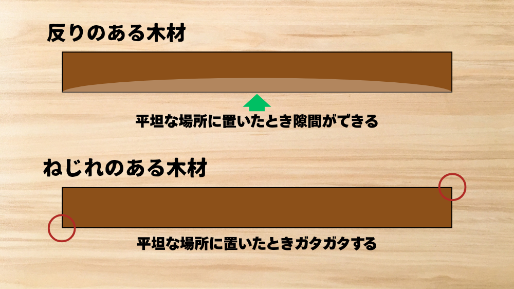 平坦な場所に置いたときに、地面と木材の間に隙間ができる時は反りが出ています。