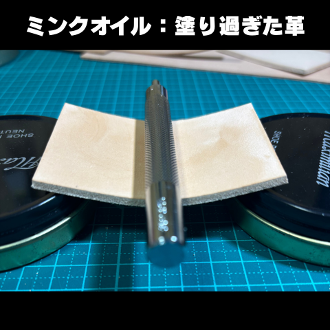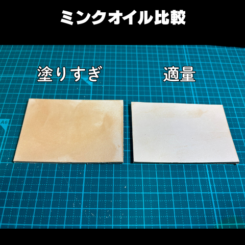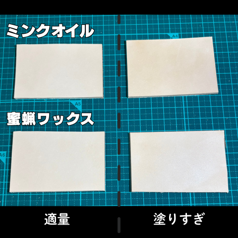 ここでは、ミンクオイルと蜜蝋ワックスを使用し、適量と過量を実際に塗って比較した画像をベースに解説していきます。