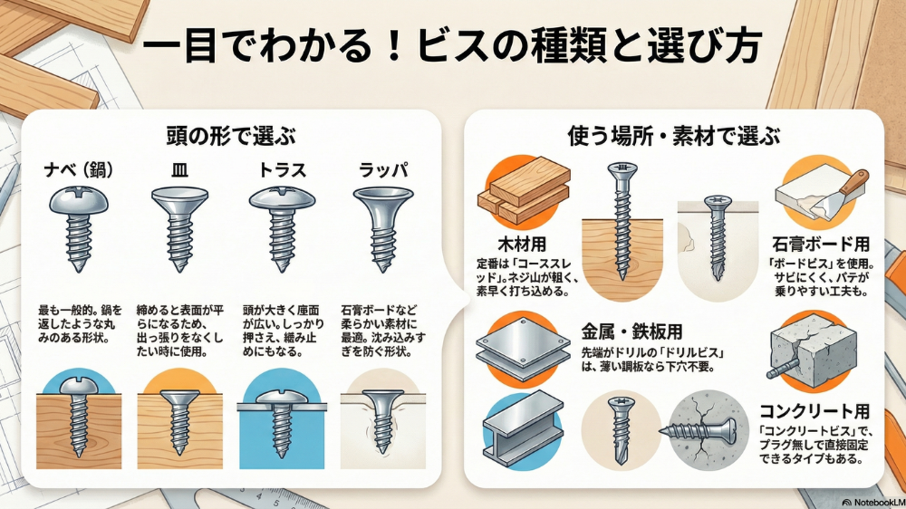 今回の記事では、DIY初心者向けにビスの形状による性能や用途の違いから、作品に適したビル選びの方法、プロも実践する意匠技術をわかりやすくまとめました。