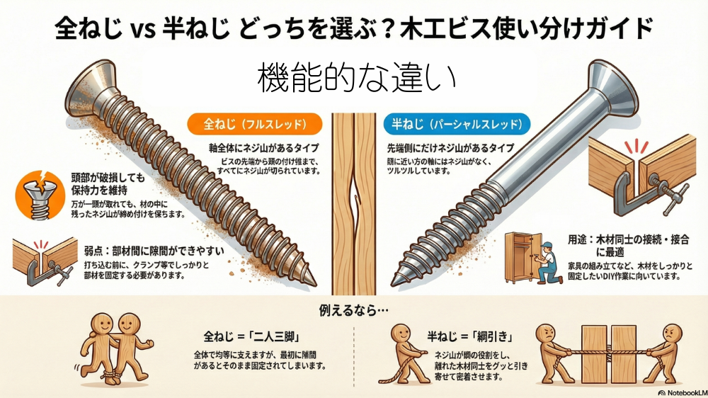 ビスには、ネジ山の付き方によって**「全ねじ」と「半ねじ」**の2種類があり、特に木材の組み立てにおいてその機能と用途には明確な違いがあります。