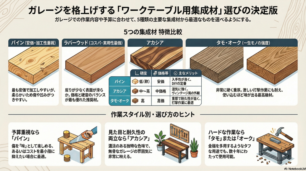 - 天板選びの基準: 過酷な使用環境に耐えうる「集成材」が、なぜワークテーブルに最適なのか。