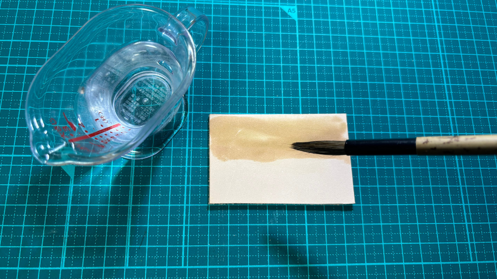 - 5〜10倍に希釈する: 刷毛で全体を染める「地染め」の場合、水で5〜10倍に薄めるのが鉄則です。「薄すぎるかな?」と思う濃度から何度も重ねることで、刷毛跡が消え、深みのある色になります。