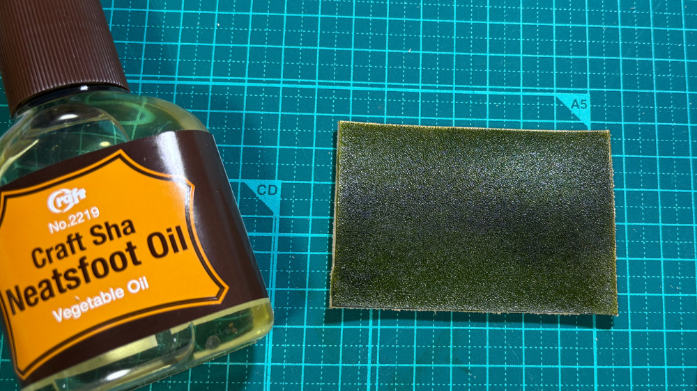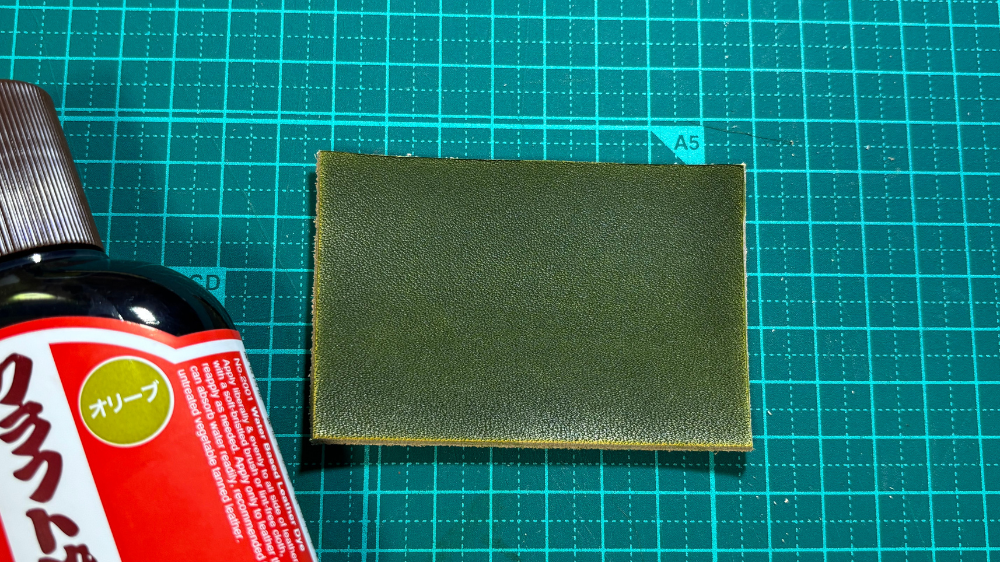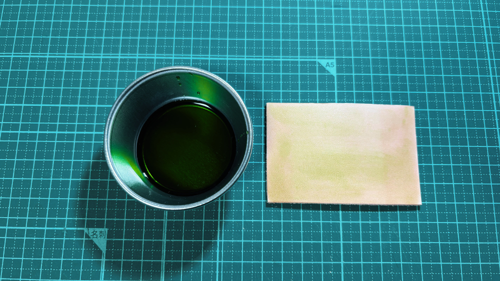 *染料を原液のまま使うとムラができるので注意が必要です。最初は薄く、徐々に染料の比率を上げて色を入れていきましょう。 - 混色(オプション): 「オリーブに金を混ぜて深い緑を作る」など、染料同士を混ぜて自分だけの色を作ることも可能です。必ず同じ種類の革の端切れで「試し塗り」をして、乾いた後の色を確認しましょう。